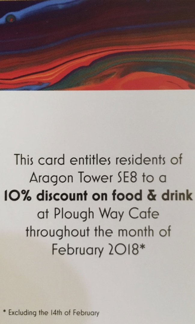 ATRA has managed to secure an exclusive 10% discount on food and drink at the Plough Way Cafe for residents of Aragon Tower only. Plough Way Cafe was opened in 2016 and offers authentic Italian cuisine, cocktails and coffees in a funky settting - only a 5 minute stroll from Aragon Tower at the Marine Wharf development.